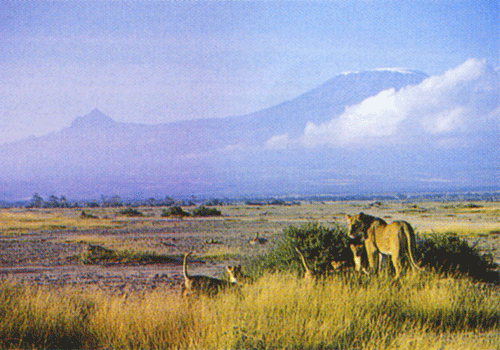この写真が撮りたくて、合計7回この公園を訪れました。動物がタンザニア側に移動し少ない上に、キリマンジャロはいつも分厚い雲に覆われていましたが、ある日突然その雄姿を現してくれました。キボ峰(右側:5896m)、マウェンジ峰(左側:5149m)共にハッキリと見られます。母親ライオンが5頭の仔ライオンを連れていました。全身が震えたのを、今でも忘れることが出来ません。